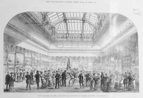 Below you can see the image of the New Gallery of the Institute of Painters in Water Colours in Piccadilly as reproduced in the Illustrated London News dated April 28th, 1883 - and exhibited in a display of the archives in the 200th exhibition