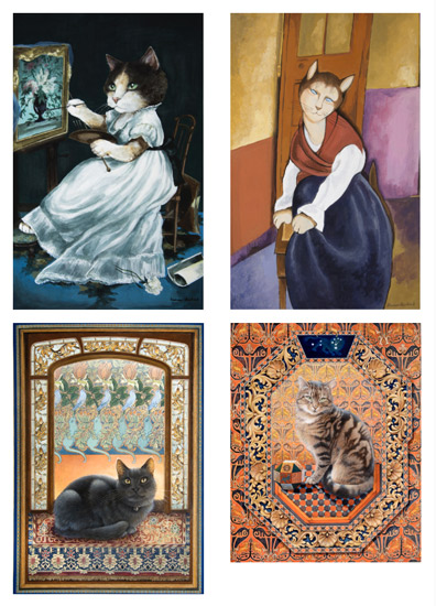 | More anthropomorphised cats by Susan Herbert plus conventional cat paintings by Lesley Anne Ivory |